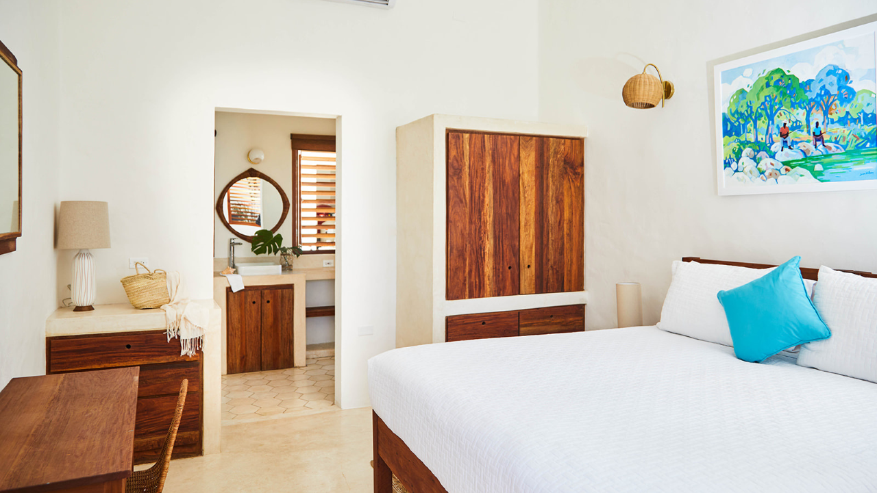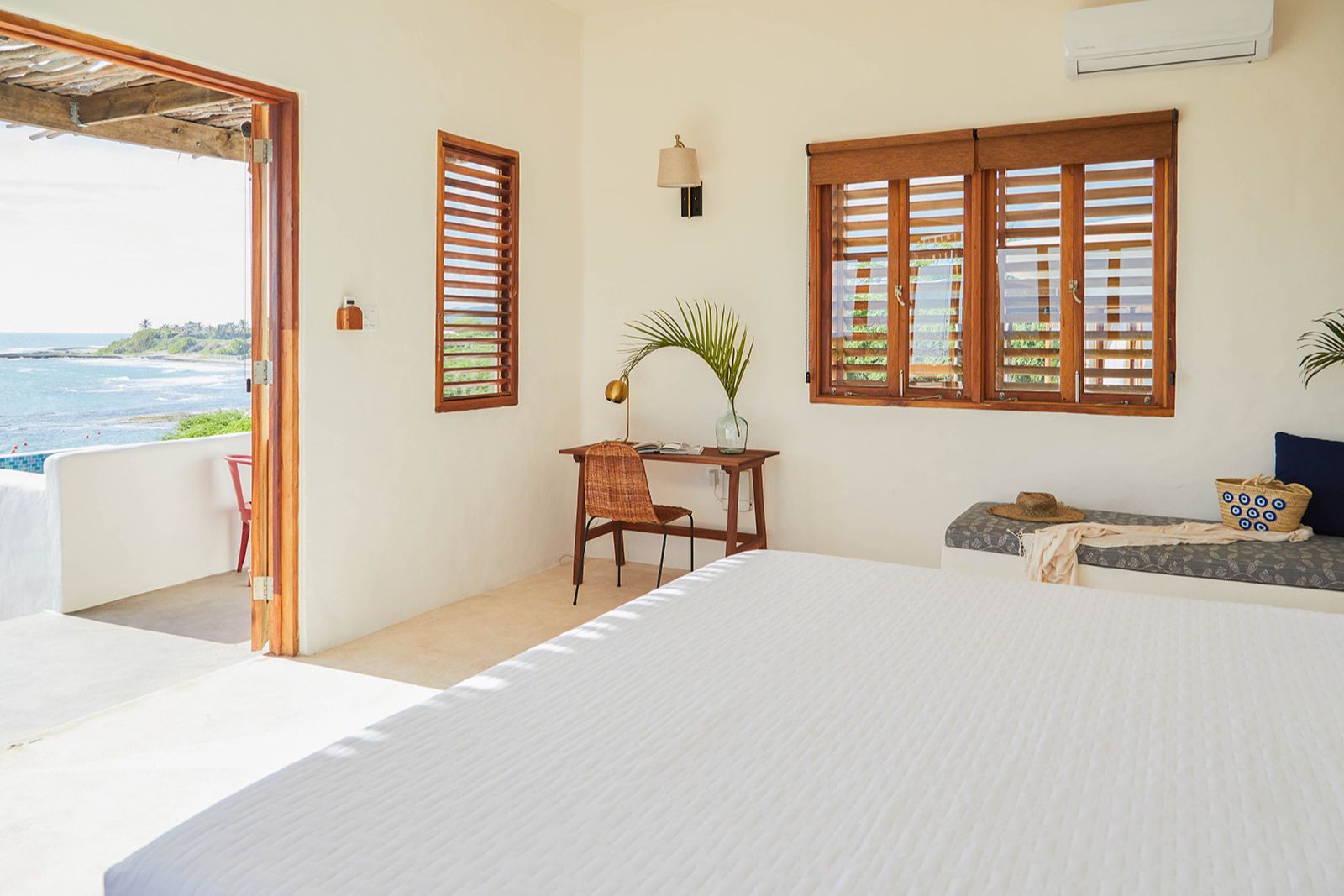 Premium Master bedroom with ensuite bathroom and kitchenette, wood louvred doors that open wide, AC and fans, large terrace lounge, outdoor shower and far-reaching ocean views.
