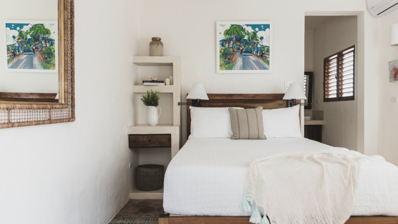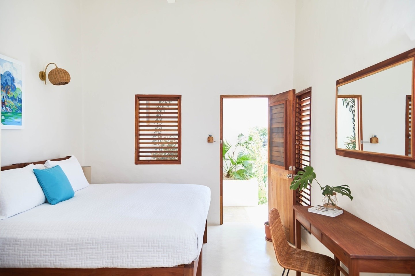 Master bedroom with Adobe-style built-in King bed frame and lounge seating. Wood-louvred French doors open up to a wide rooftop patio with its own plunge pool and sunbathing deck. A second rooftop terrace with outdoor shower is accessed from the full ensuite bathroom. Room includes AC, fans, flat screen television.