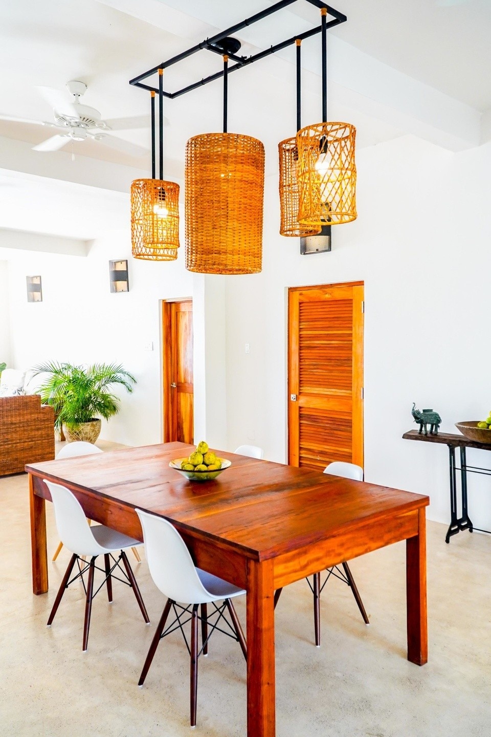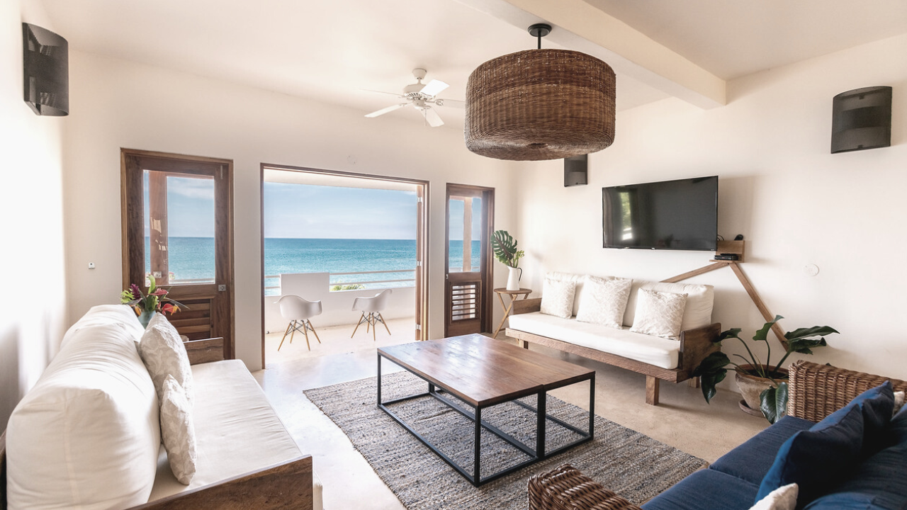 Two Master bedrooms with King beds and AC adjoined by a spacious living and dining area, flat screen television, ensuite bathrooms, full kitchen, fans and seaside terrace.