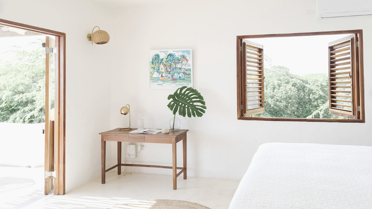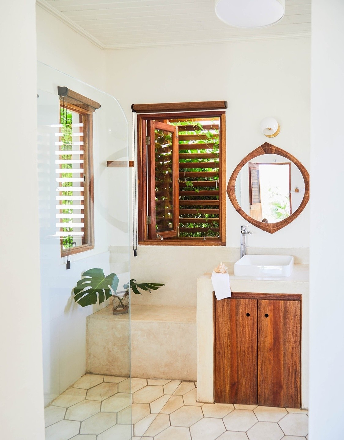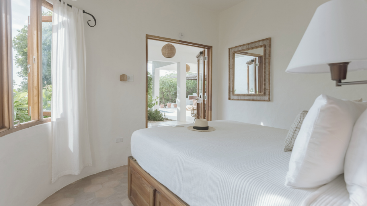 Softly curved walls cooled by the shading of the outdoor pergola. Master with Queen-sized or twin-sized beds, AC, fan, flat screen tv. Ocean-facing balcony and semi-outdoor shower; full ensuite bathroom.
